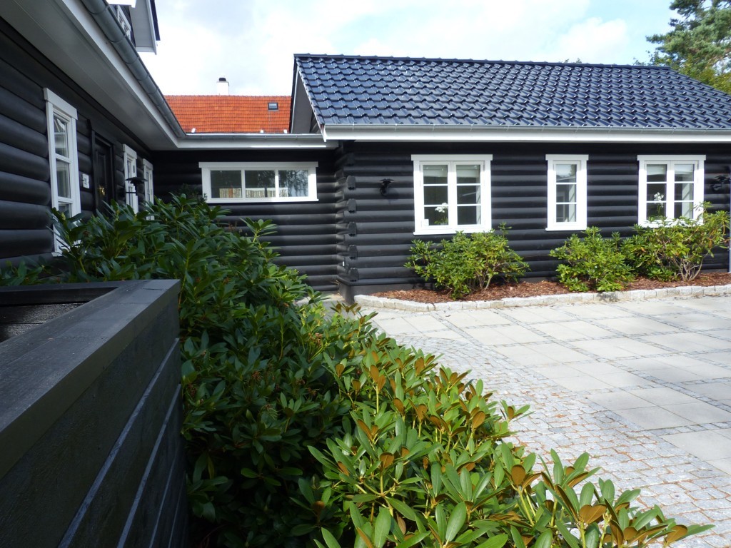 Hovedbygning og sidebygning danner sammen med den mindre fitness bygning en moderne tre-længet gård. Ved samtidig at bygge træhegnet vinkelret ud fra fitness bygningen er skabt en næsten lukket gård med flise- og granitbelægning samt stedsegrønne buske og masser af potter. Det sortmalede hegn adskiller samtidig gårdrummet fra p- arealet.