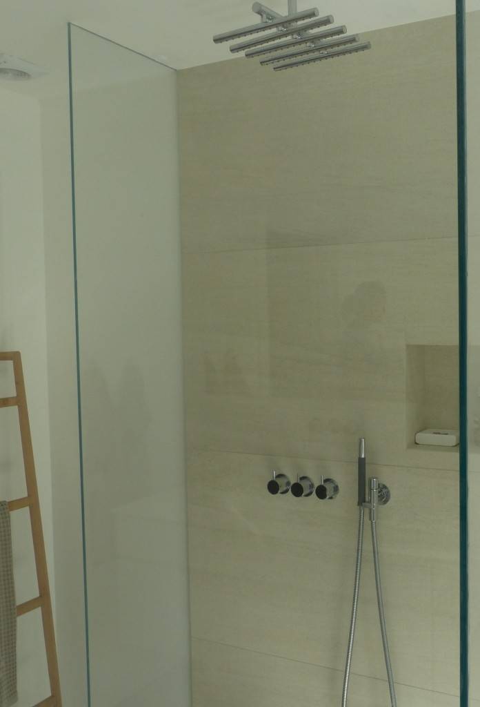 I badværelse og bryggers blev lagt 70 x 70 cm store lyse travertin gulvfliser med knasfuger.