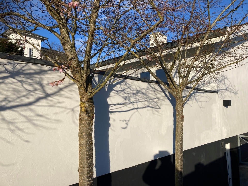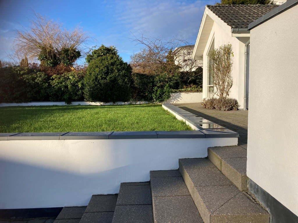 Da grunden falder mod syd blev den lange støttemur vinkelret på huset og vejen opført, så skråningen kunne opfyldes med grus og jord, så forhaven kom i niveau med huset, så den bedre kunne udnyttes til ophold og hævet i forhold til vejen. Sammen med dette og muren parallelt med huset ud mod p- arealet blev skabt den solrige terrasse med udsigt og god kontakt mellem inde- og uderum. Mod nord ud for køkken/alrum blev også anlagt terrasses for at skabe god forbindelse mellem køkken og uderum.