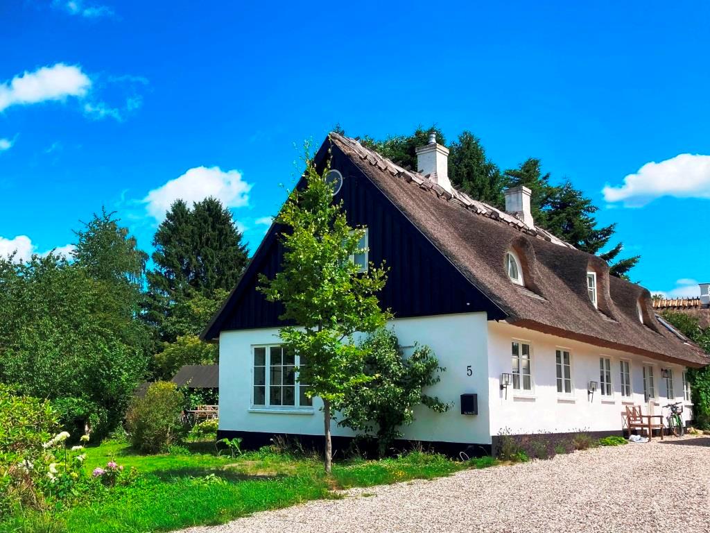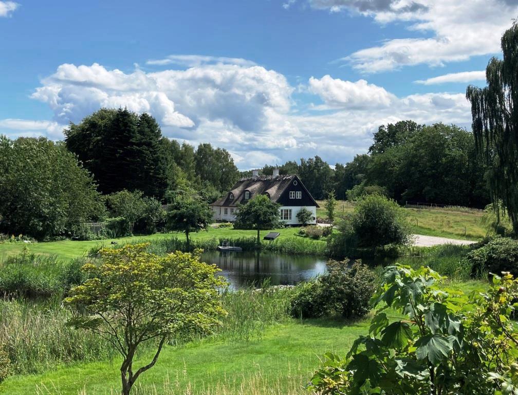 I forbindelse med nyt stråtag på ejendommen projekterede vi brandsikring af taget og nye tagkviste samt enkelte ændringer på vinduer og indretning. På bagsiden projekterede vi et udhus incl. vognport, som lige kan anes på foto. Endelig projekterede vi et orangeri mellem huset og søen, som dog foreløbig er udsat.